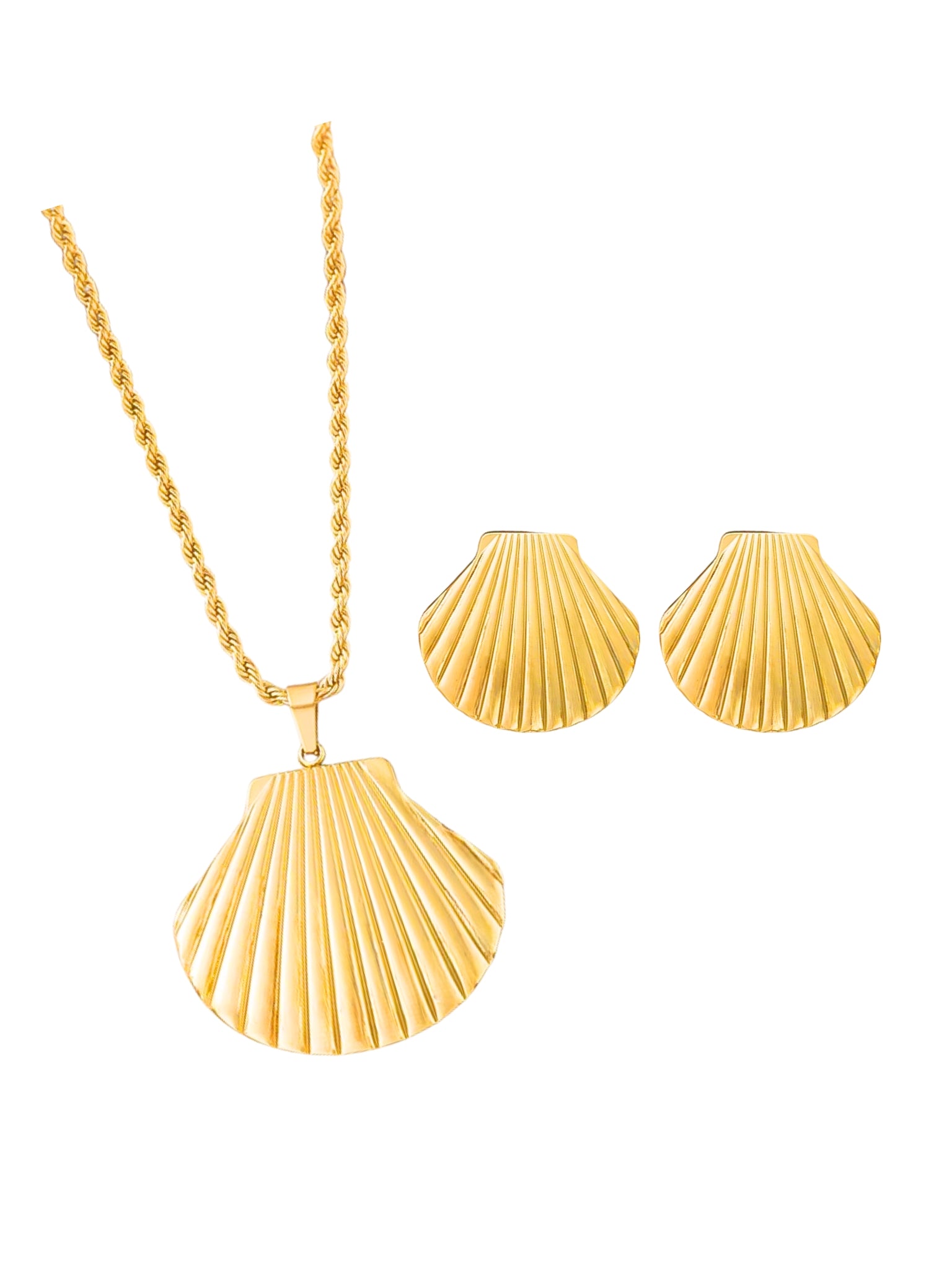 The Chelle Jewellery Set features a delicate shell pendant and matching earrings, designed to add a subtle touch of elegance to any outfit. This set combines timeless style with everyday wearability, making it perfect for both casual and special occasions.